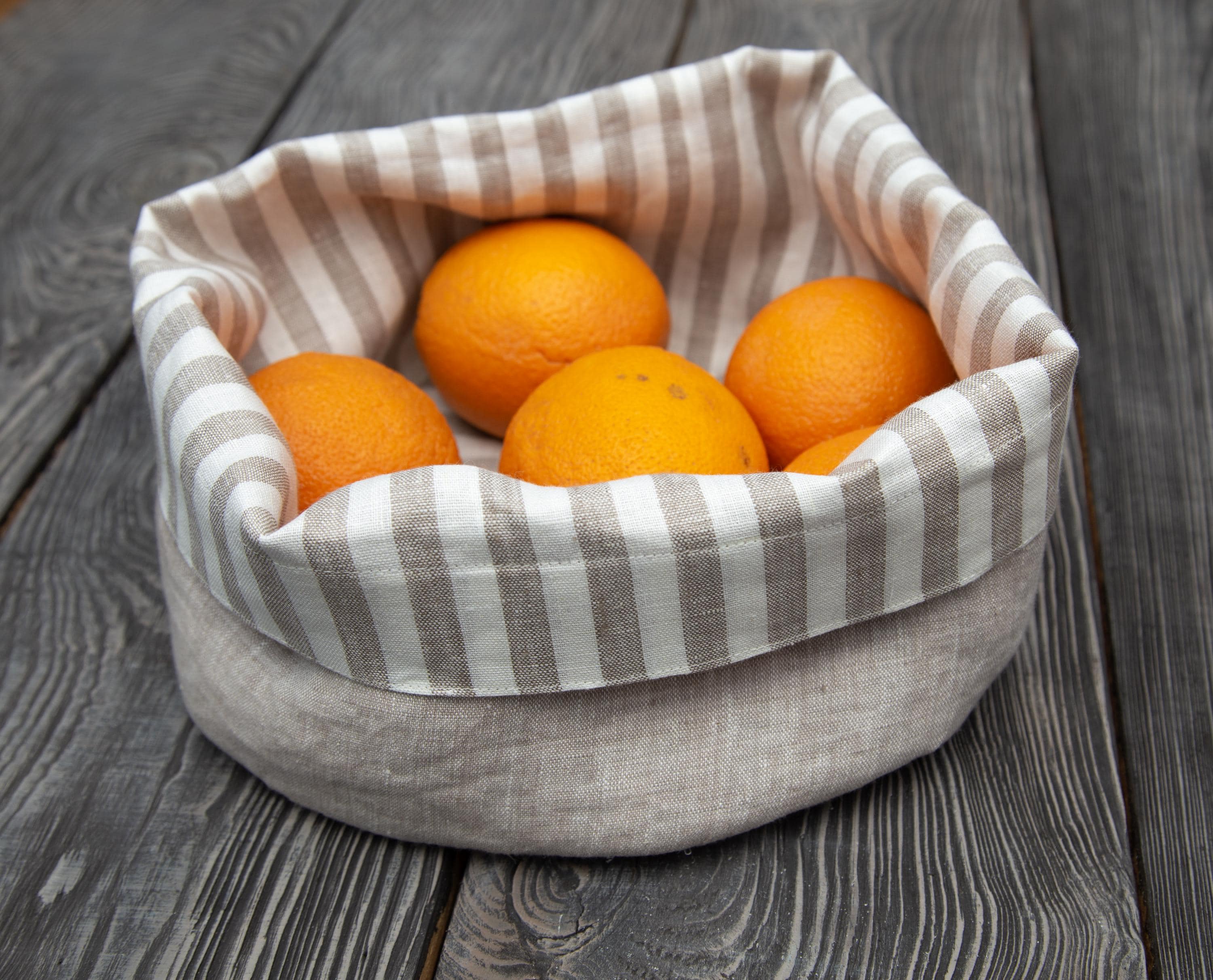 Handmade double-layer basket made of 100% natural linen. Ideal for food storage or table decor. Features a double-layer construction for durability, allowing use of both sides. Suitable for storing bread, eggs, or apples. Eco-friendly and wear-resistant. Pre-washed to prevent shrinkage. Machine washable at 35°C. Do not tumble dry.